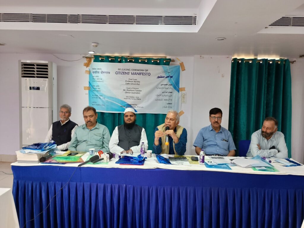 غیر سیاسی تنظیم بہار ڈیموکریٹک فورم نے جمعرات کو پٹنہ میں عوامی منشور جاری کیا، جس میں عام لوگوں کے مسائل کو اجاگر کرتے ہوئے ان کے حل پر زور دیا گیا۔